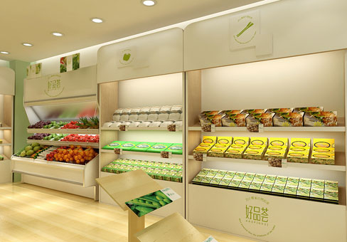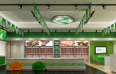 上海公裝公司案例:本案生鮮超市后現代工業(yè)風,賣場個性化設計,點睛綠可讓整個空間鮮活起來。