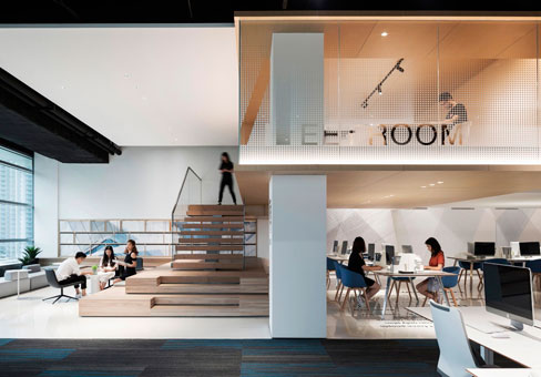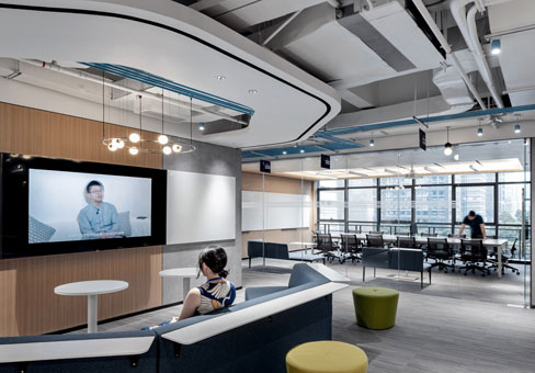 上海辦公室裝修公司案例:不同的材料和照明為每個層次和活動帶來溫暖和個性。循環(huán)模式提供了各種移動和居住空間的體驗。